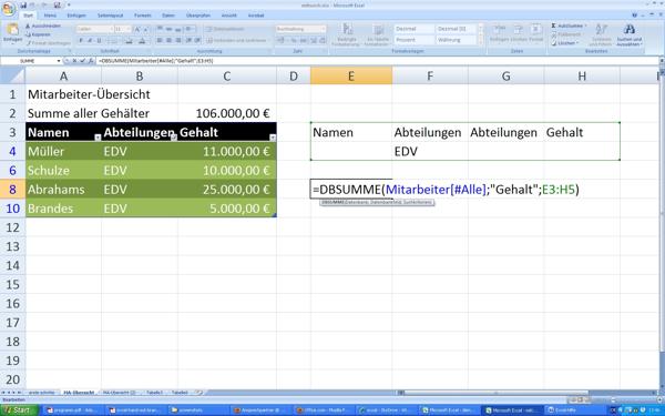 =DBSUMME(Mitarbeiter[#Alle];"Gehalt";E3:E4) - Datum- und Uhrzeitzellen und -Funktionen