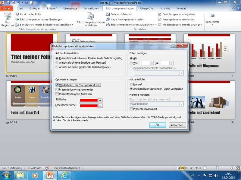 Einblendezeiten testen, Bildschirmpräsentation einrichten (Mulitimonitor: Monitor für Präsentation festlegen, Kiosk-System/endlos), Bildschirmpräsentation starten (ab Folie 1) mittels F5; ab aktueller Folie mit Umschalten + F5, in Präsentation Stifte nutzen; Neue Anzeigedauern testen