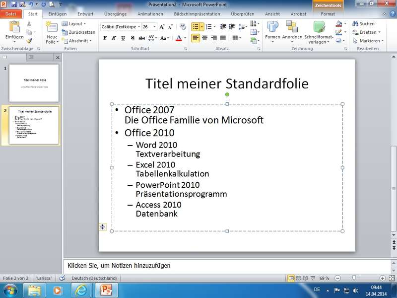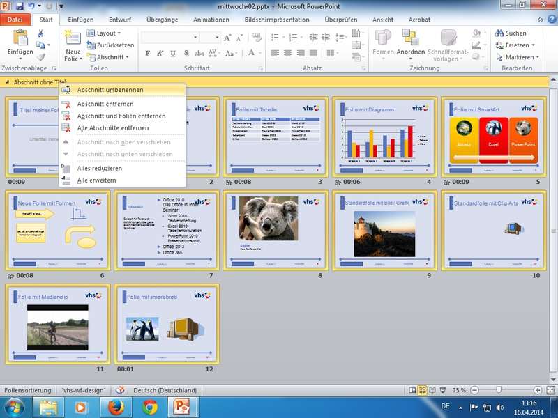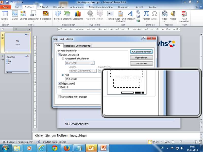 In der "kurzen Karfreitag-Woche" vom 14. bis 17. April 2014 findet an der VHS Wolfenbüttel ein Bildungsurlaub (Ganztagsveranstaltung) zum Thema "Präsentieren mit PowerPoint 2010" statt.