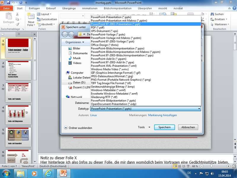 Übung: mit PowerPoint 2010 im abwärtskompatiblem *.ppt Format; Hinweis auf Kompatibilitätsprobleme