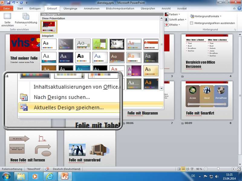 Tipp: Farben und Design in "leerer" Präsentation gestalten und als Präsentation (*.pptx) speichern - so kann man die Gestalltung einfach als Präsentation versenden und am Arbeits-PC mittels Design - Aktuelles Design speichern.. in die lokale Office-Benutzer-Umgebung integrieren und bereitstellen