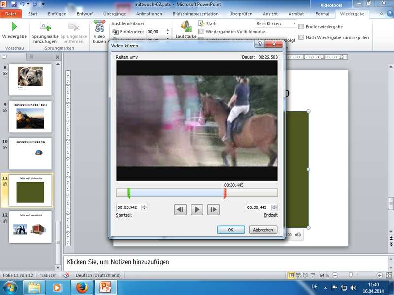 speziell: bei Videos den Clip auf Anfang und Ende konfiguriert (Video kürzen); möglichst Windows-Mulitimedia-Formate (bzw. Multimedia-Container) wie WMA (Windows Media Audio) bzw. WMV (Windows Media Video) nutzen - Beispielvorlage Microsoft PowerPoint 2010