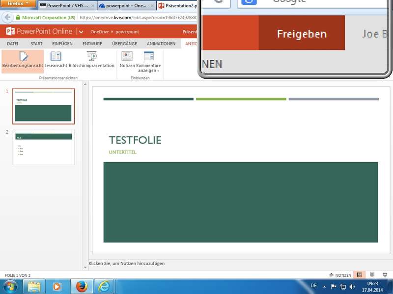 Beispielhafte Erstellung einer Folie mittels Online-WebApp PowerPoint im Browser gezeigt