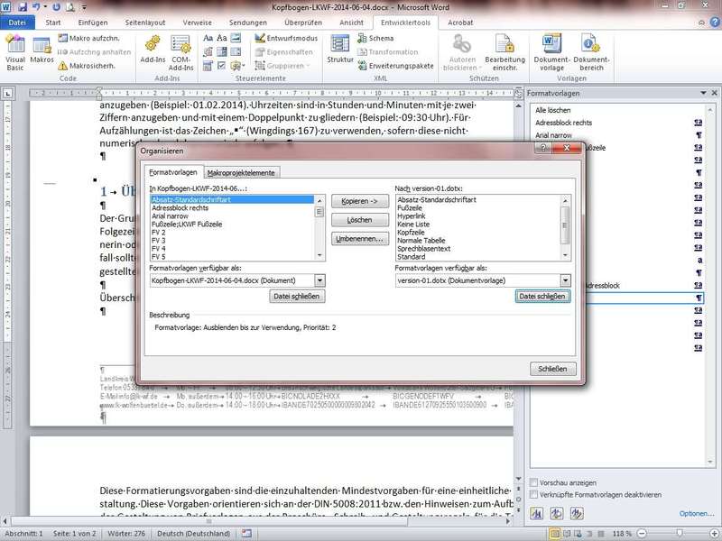 Austausch von Formatvorlagen mittels Ribbon Entwicklertools - Dokumentvorlage - Organisieren (in Dialogfenster Dokumentvorlage kann man auch die zugrunde liegende Dokumentvorlage sehen und ggf. austauschen und aktualisieren)