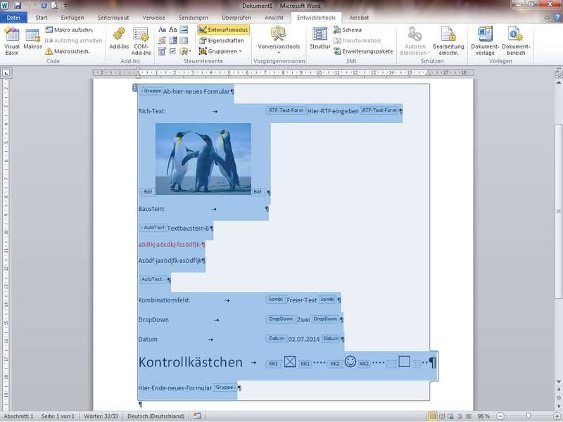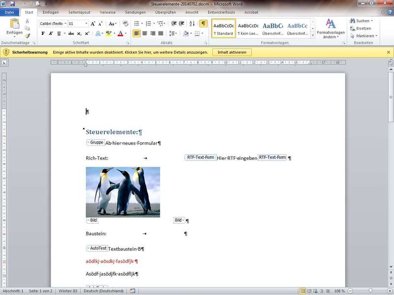 Übungen mit Rich-Text, Bild, Bausteinkatalog (siehe AutoTexte mit Kategorien anlegen), Kombinationsfeld (hier auch Eingabe von nicht vorgegebenen Werten möglich), Listenfeld (nur vorgegebene Werte), Datumsauswahl (attraktiver Datumswähler), Kontrollkästchen (mit weitreichenden Gestaltungsmöglichkeiten
