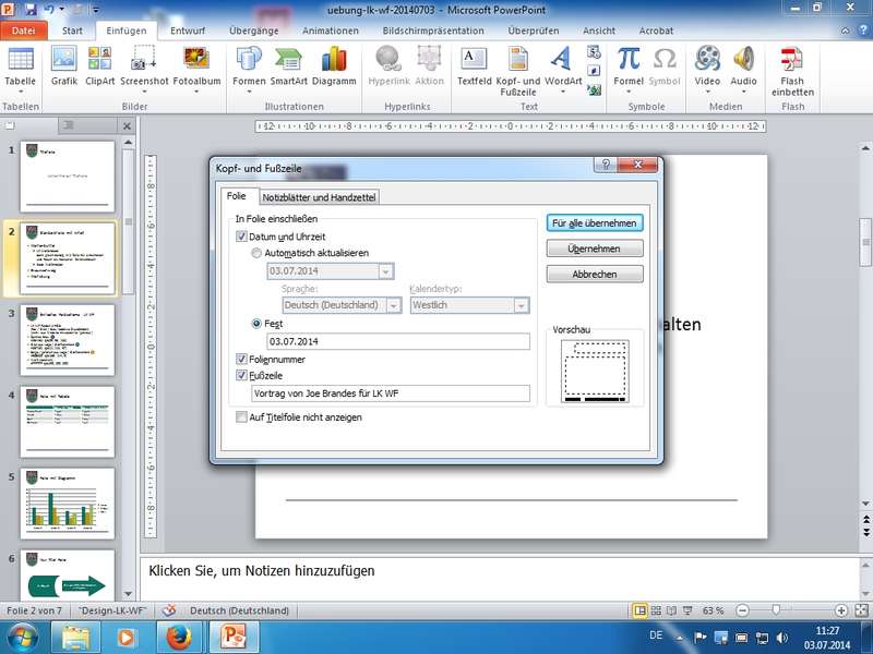 in Designs befinden sich Platzhaltern für "Datum und Uhrzeit", "Datum" und "Fußzeile"; Aktivieren der Platzhalterstellen über Ribbon Einfügen - Kopf- und Fußzeile; Spezielle Behandlung von Titelfolien - Übergange (Ribbon - Menüband)