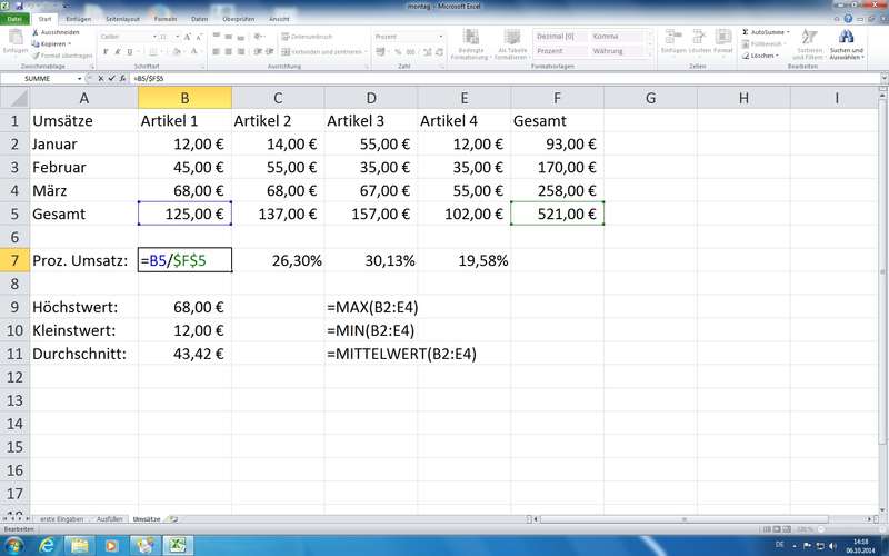relative Zellbezüge erlauben das Kopieren (Ziehen) der Formeln