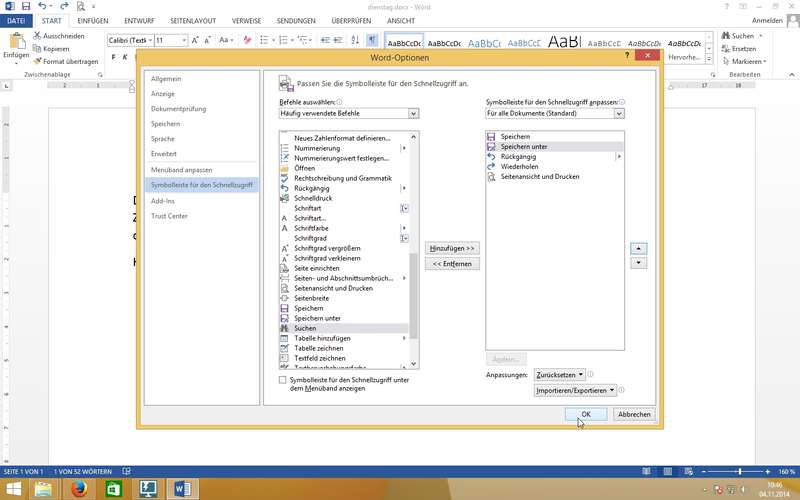 ein Beispiel für die Office-Programme aus den Versionen 2013; erstes Speichern mit Hinweis auf Datenlaufwerk D: beachten wegen Reborn-Card (Rücksetzung von Systemlaufwerk C:)