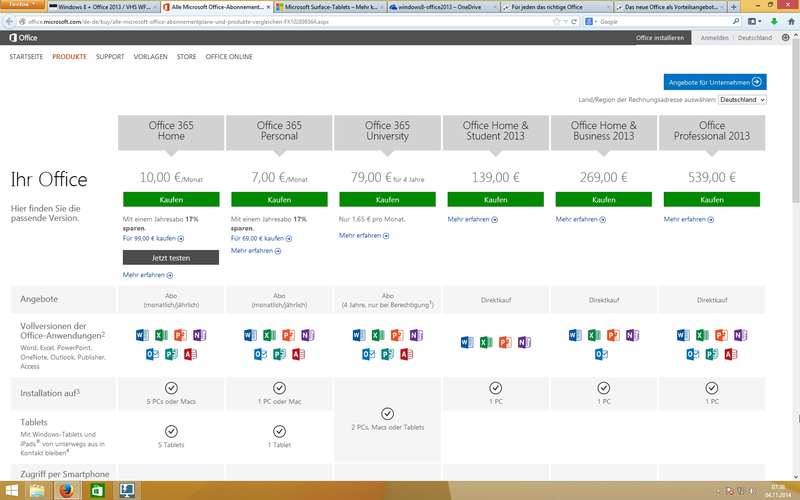 Hinweise auf Preise, Installationsarten (Plattformen PC und Mac sowie Windows 8 Tablets) und Lizensierungen (Software klassisch kaufen vs. Mietlizenzen), Versionen (Home and Student, Home and Business, Professional), Preise recherchiert bei diversen IT-Häusern (siehe Beispiel HWH)