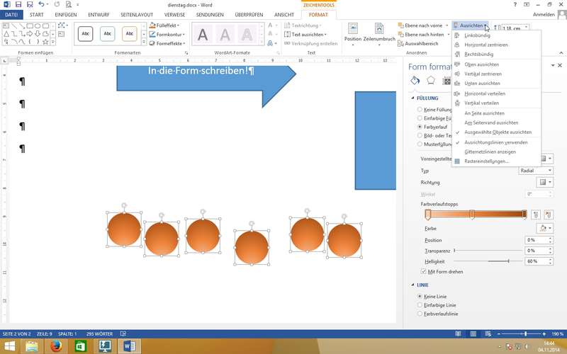 Formen: Zeichnenelemente, die sich automatisch mit Text versehen lassen, Symmetrien erzeugen (oder erhalten) mit gedrückter Umschalten-Taste (aus Elipse wird Kreis, aus Rechteck ein Quadrat, beim Drehen hat man feste Winkel), Objekt vor- /hintereinander anordnen, mehrere Objekte mit Strg-Taste markieren, Ausrichten über Menüband Format: z.B. vertikal zentrieren, horizontal verteilen; Gruppieren von Objekten - PowerPoint 2013