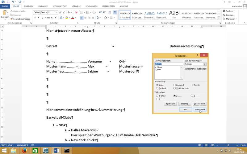 Übung siehe auch Kopf-/Fußzeilen; eigene kleine Liste mit linksbündigen Tabulatoren erstellt; Handling der Tabulatoren-Positionen über das Lineal - dort auch Einzüge links, erste Zeile, hängend, rechts