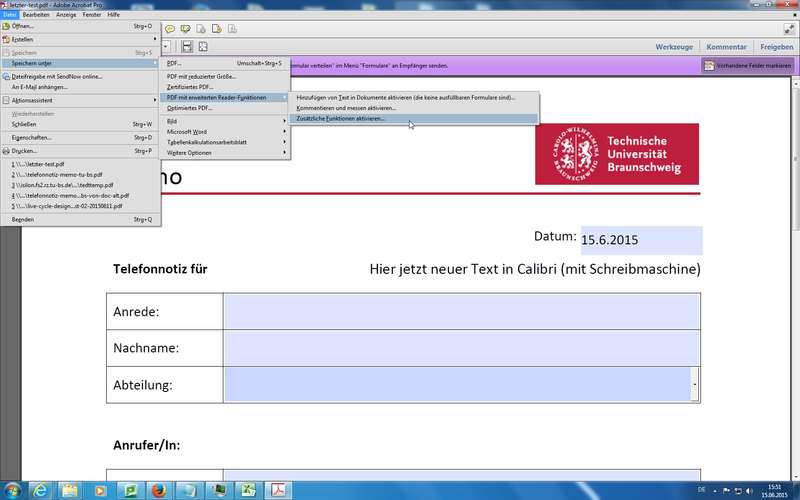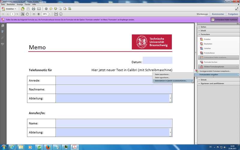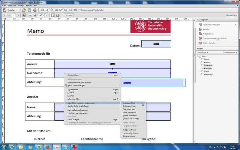 Im Rahmen der Mitarbeiterfortbildungen an der TU Braunschweig findet am 15.06.2015 ein Seminar zum Thema "PDF Formulare erstellen" statt. Mit den Adobe Acrobat Tools sollen die notwendigen Schritte zum Erstellen und Verfeinern elektronischer Formulare auf PDF-Basis erarbeitet werden.