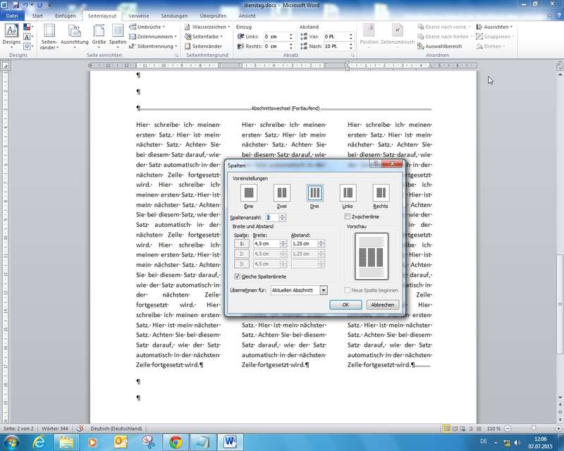 Arbeiten mit Spalten, Abschnitten und Seitenformaten