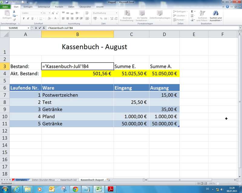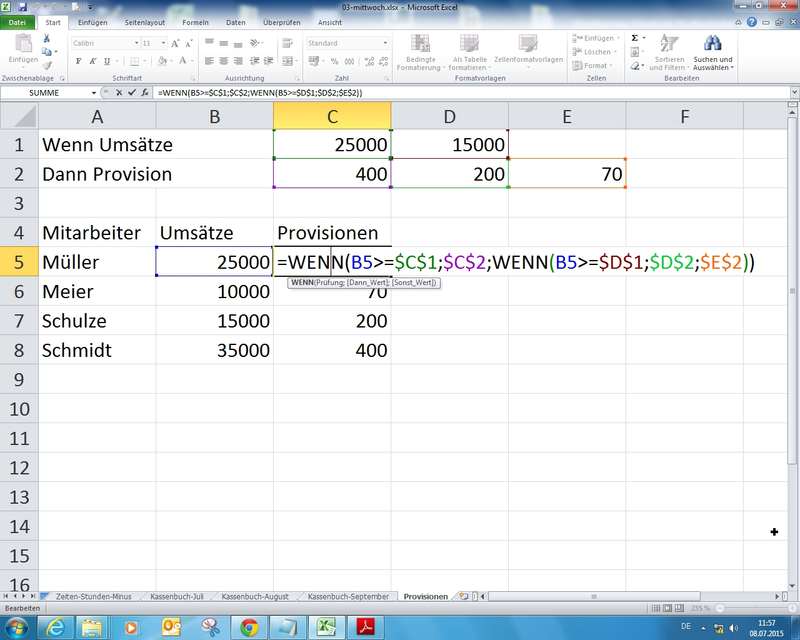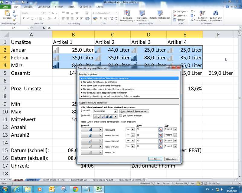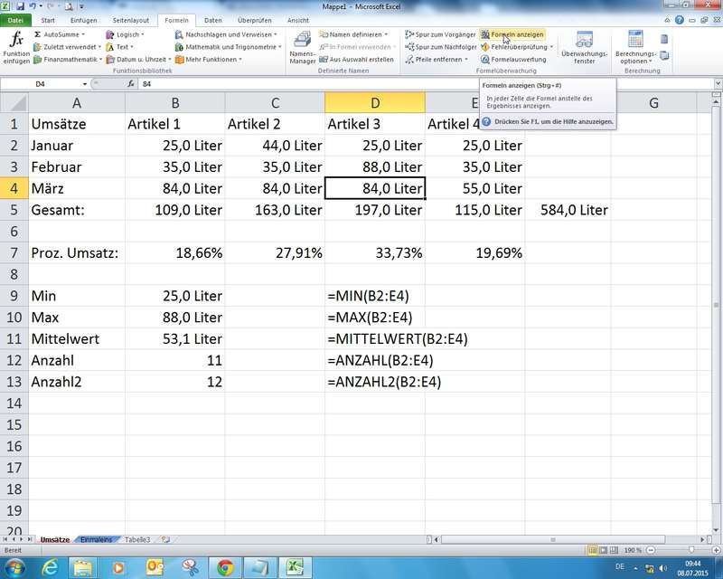 Formeln über Tabellenblätter hinweg: =SUMME(Umsätze!B2:D5) - Zellformate