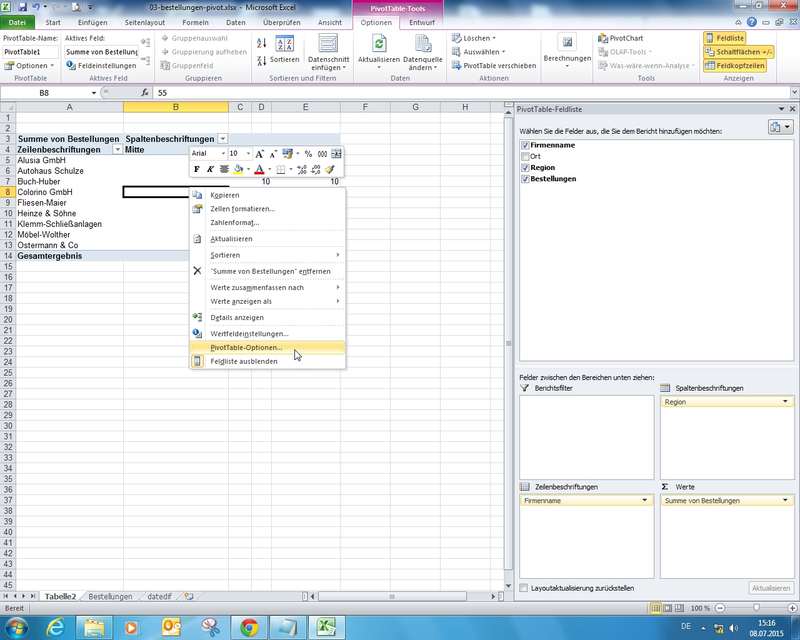 Eigenschaften von Feldern und Gesamt-PivotTable geändert (z.B. automatisches Anpassen Spaltenbreiten deaktiviert)