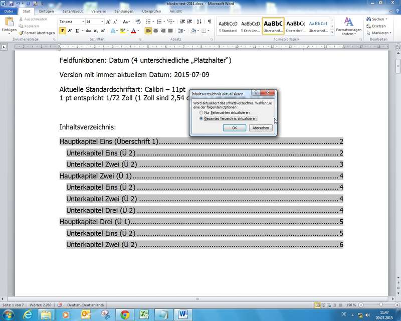 Tipp: Feldfunktionen aktualisieren mit F9 oder generell über Menüband Datei - Optionen - Register Ansicht das Kontrollkästchen "Felder vor dem Drucken aktualisieren" einstellen