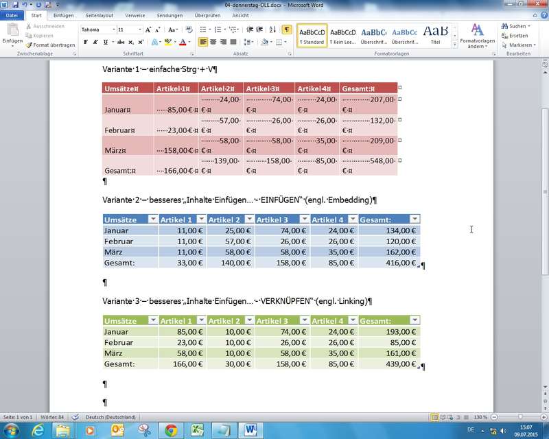 Vor- und Nachteile diskutiert, Verknüpfungen-Dialog (Rechte Maus) zur Reparatur und Anpassung; in Netzwerkpfaden funktionieren die automatischen Aktualisierungen unter den verknüpften Doksmeistens nicht: dann bitte über Kontextmenü manuell automatisieren - TN-Bescheinigungen, letzte Fragen