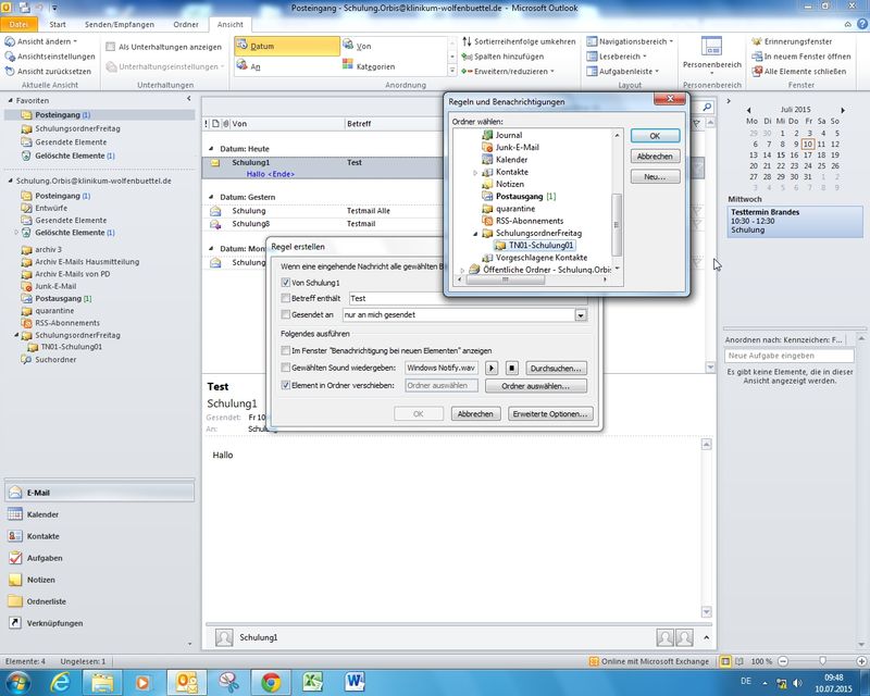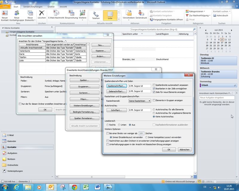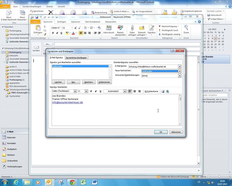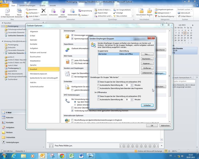 diverse Einstellungen in den verschiedenen Hauptkategorien der Optionen durchgegangen; hier beispielhaft aufgeführt: Oberfläche ändern (Farben, Live-Vorschau), E-Mail-Formate (HTML, Rich-Text, Nur-Text), Sendeverhalten (nicht sofort Senden, Konten konfigurieren), Einstellungen zu Kalender und Kontakten, Einblenden des Journals (Protokoll zu E-Mail und Co), ... - TN-Bescheinigungen, letzte Fragen