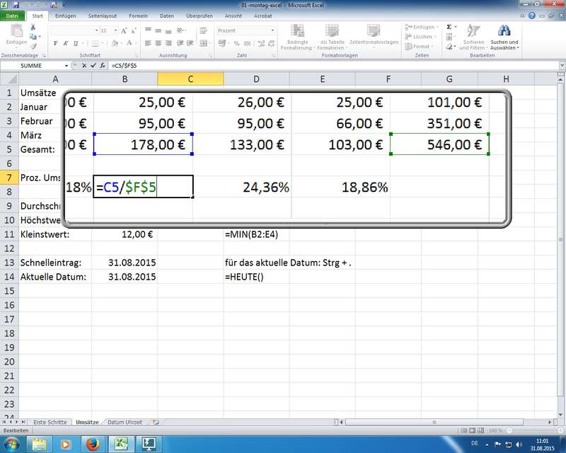 erste einfache Formeln mit "Arithmetischen Operatoren" ;-) also: + - / * - Zellen in Spalten und Zeilen