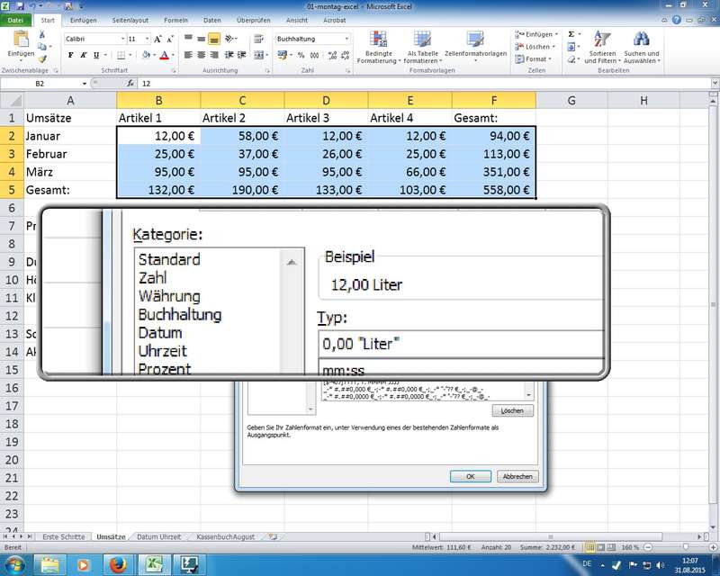 am Beispiel mit Litern: 0,00 "Liter" formatiert Zahl 15 zu 15,00 Liter