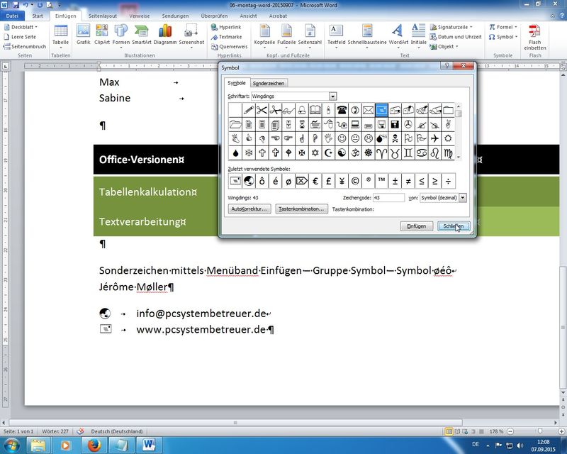Übung: Mailsymbol (vor E-Mail-Adresse), Websymbol (Weltkugel vor Webseitenadresse - URL) - Excel - Tabellenkalkulation