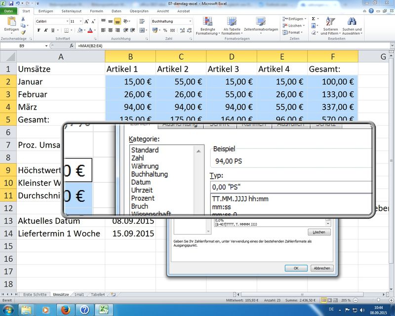 Spezial: Datum und Uhrzeit sind spezielle Zahlenformate (siehe Rechte Maus - Zellen formatieren...) mit Zahleninhalten mit Bezug auf den 01.01.1900 bei Microsoft Systemen; keine negativen Uhrzeitformate möglich (Hinweis auf ####### in Zellen)