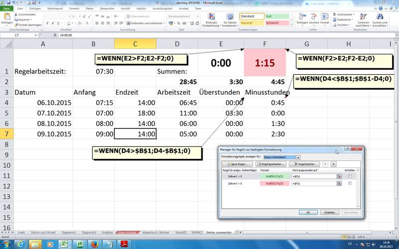 Anm.: negative Zellen (Zahlen kleiner 0) lassen sich nicht in Uhrzeit-Format darstellen -> Einsatz von WENN-Funktion