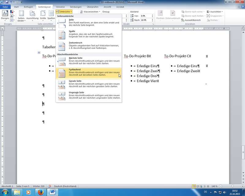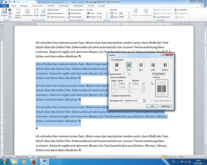 Übung siehe Kopf-/Fußzeilen; eigene kleine Liste mit linksbündigen Tabulatoren erstellt; Handling der Tabulatoren-Positionen über das Lineal - dort auch Einzüge links, erste Zeile, hängend, rechts - Spaltenlayout
