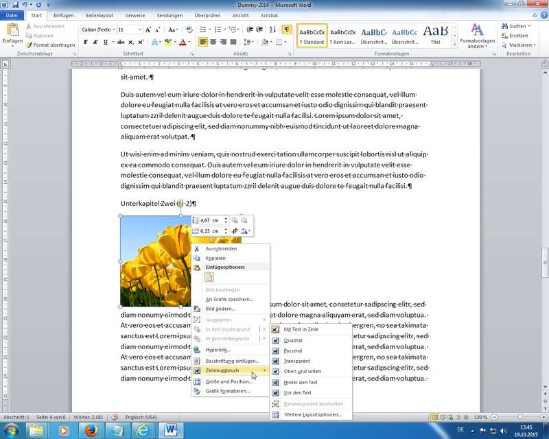 mit Hilfe von Zeilenumbruch (Rechte Maus oder Menübänder) den Textfluss um die Bilder konfiguriert und die Bilder mit Schnellformatvorlagen (Effekten / Rahmungen / Schatten / Spiegelungen) versehen