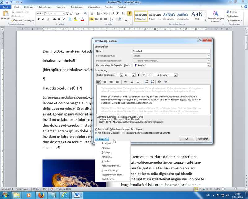 Anspassen der Formatvorlagen mittels Fenster Formatvorlagen - Vorlage - Ändern