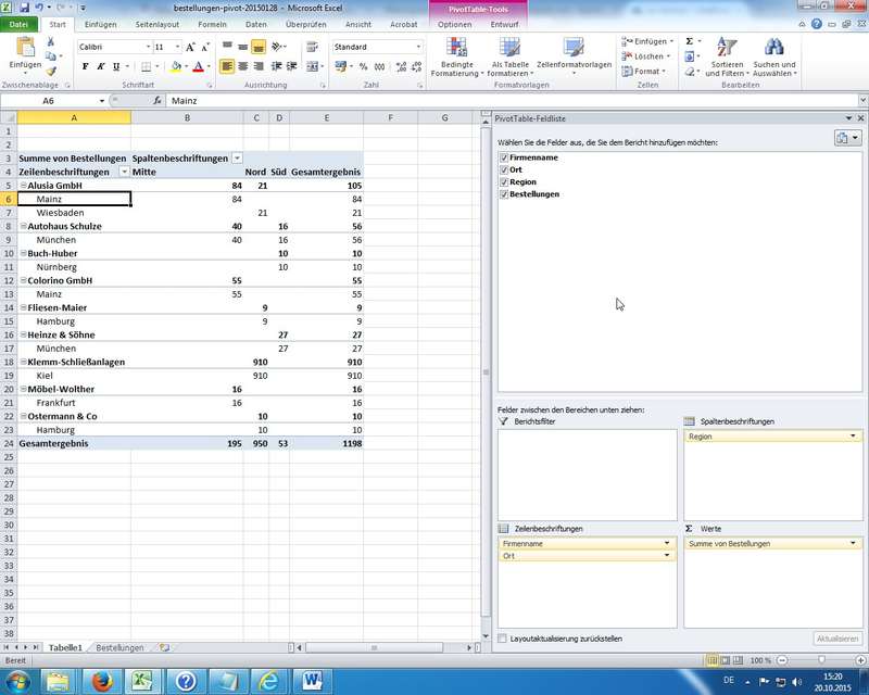Hinzweis: beim Ändern der Datenbereiche für die PivotTable muss man diese manuell aktualisieren (Kontextmenü oder Schaltfläche Aktualisieren in Ribbon Optionen der PivotTable-Tools