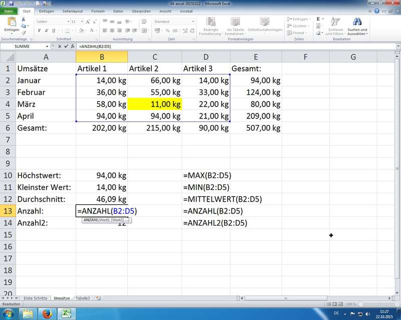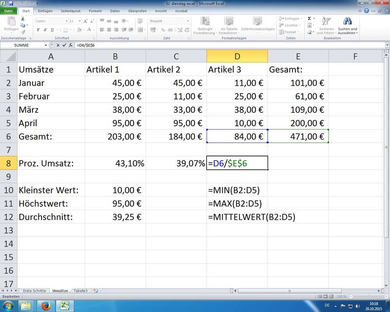 Arbeiten mit Formeln und Funktionen, Verknüpfungen, Formaten; Diagramme - Tag 3: Word 2010