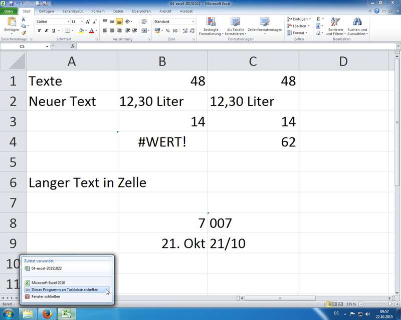 Texte, Zahlen und Formeln; letztere beginnen immer mit einem "="