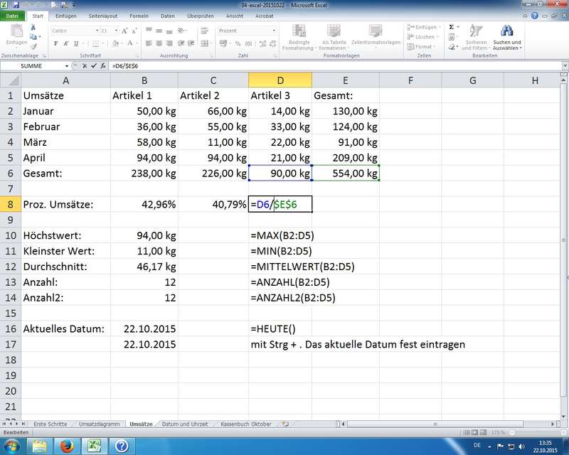Vorgabe: Arbeiten mit Formeln und Funktionen, Verknüpfungen, Formaten; Diagramme