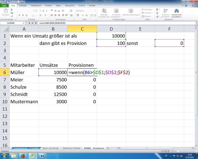 Nutzung von Zellen für Vergleichswerte in Prüfungen und für Berechnungen in den Dann/Sonst-Zweigen verlangen wieder nach den absoluten Zellbezügen, damit sich die Funktionen auch sauber kopieren lassen (nach unten ziehen lassen) - TN-Bescheinigungen, letzte Fragen