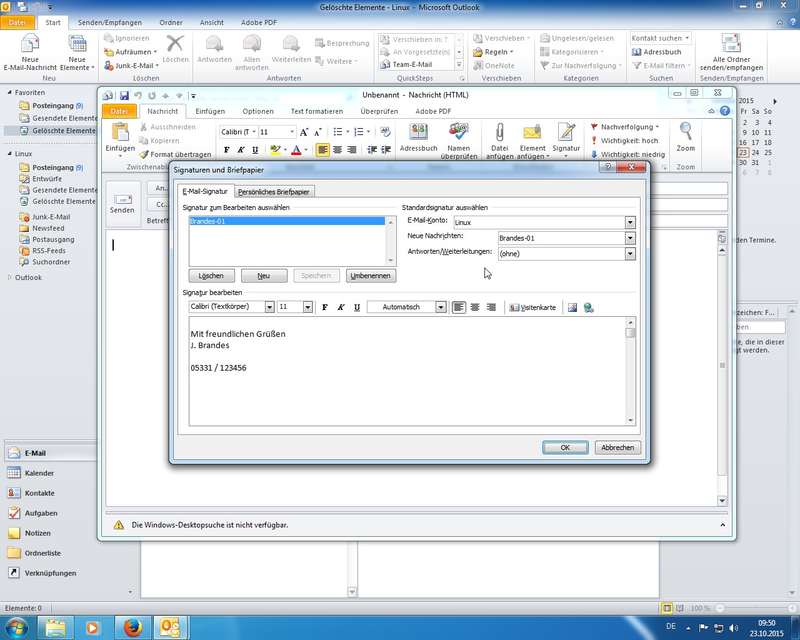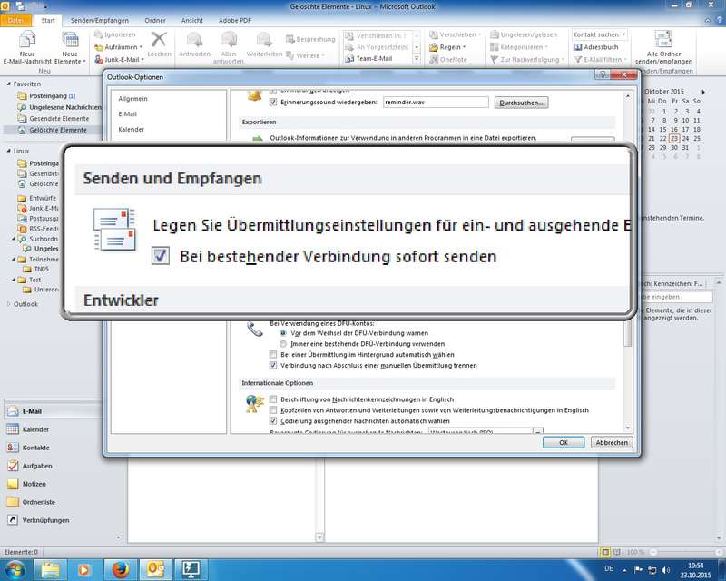 diverse Einstellungen in den verschiedenen Hauptkategorien der Optionen durchgegangen; hier beispielhaft aufgeführt: Oberfläche ändern (Farben, Live-Vorschau), E-Mail-Formate (HTML, Rich-Text, Nur-Text), Sendeverhalten (nicht sofort Senden, Konten konfigurieren), Einstellungen zu Kalender und Kontakten, Einblenden des Journals (Protokoll zu E-Mail und Co), ...