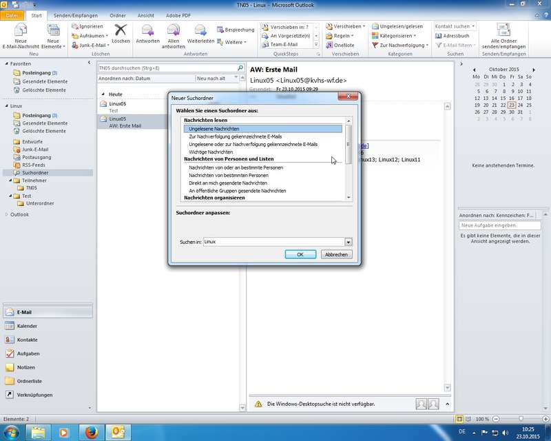 Mails versendet/empfangen (manuell mit F9 oder entsprechenden Symbolen "Senden und Empfangen"), Nutzung von "An", "Cc" (Carbon Copy - "Blaupause/Durchschlag"), "Bcc" (Blind Carbon Copy - Tipp: für Massenmails nutzen und so den notwendigen Datenschutz bereitstellen), Betreff: bitte immer angeben, Anhänge (eigenes Menüband), Kontakte - Adressbuch, Sofort senden (siehe Optionen - Erweitert - Senden und Empfangen), Gelesen / Ungelesen - Alles als gelesen markieren, eigene Ordnerstrukturen (Mails manuell ordnen), Regeln (Filter) für das automatische Ablegen von einkommenden Mails, Signaturen anlegen und verwalten; Kontaktgruppen (Verteilerlisten für E-Mail-Kontakte); Suchordner (Übung: schnell alle ungelesenen Mails anzeigen lassen) - Kontakte