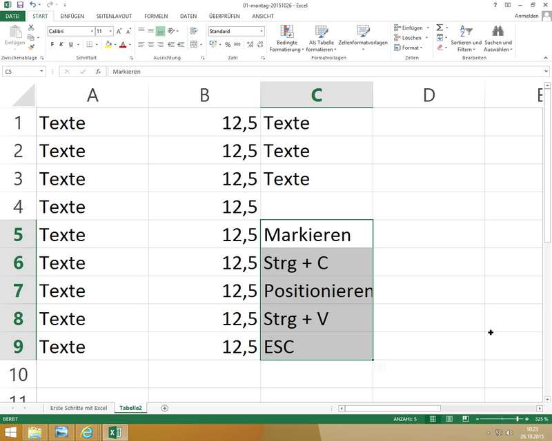 Mausaktionen mittels "Ziehen und Fallenlassen"; Praxis mit Zellen, Zellbereichen und Tabellenblättern