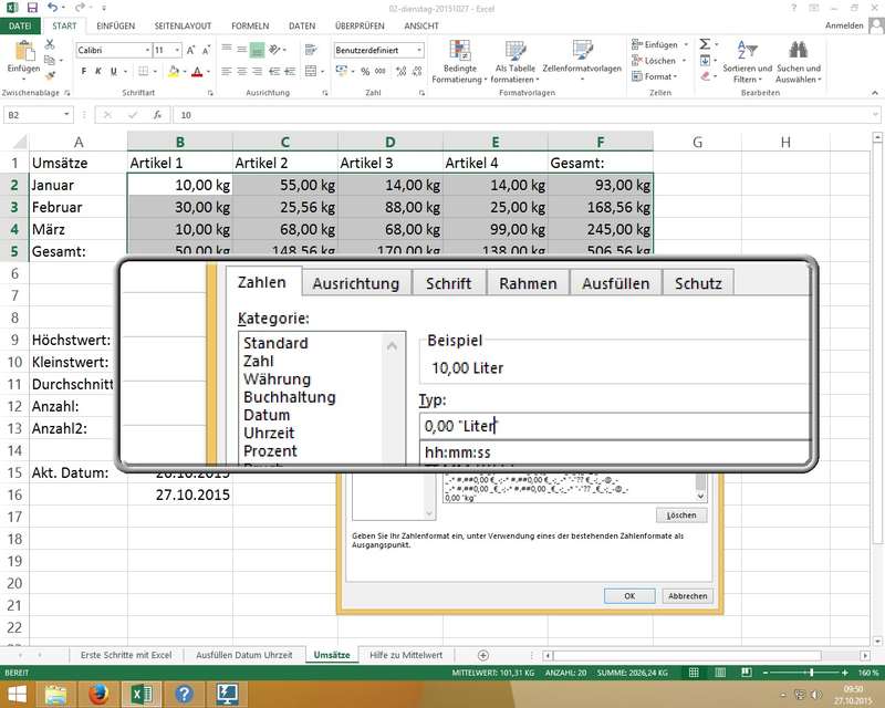 am Beispiel mit Litern: 0,00 "Liter" formatiert Zahl 15 zu 15,00 Liter