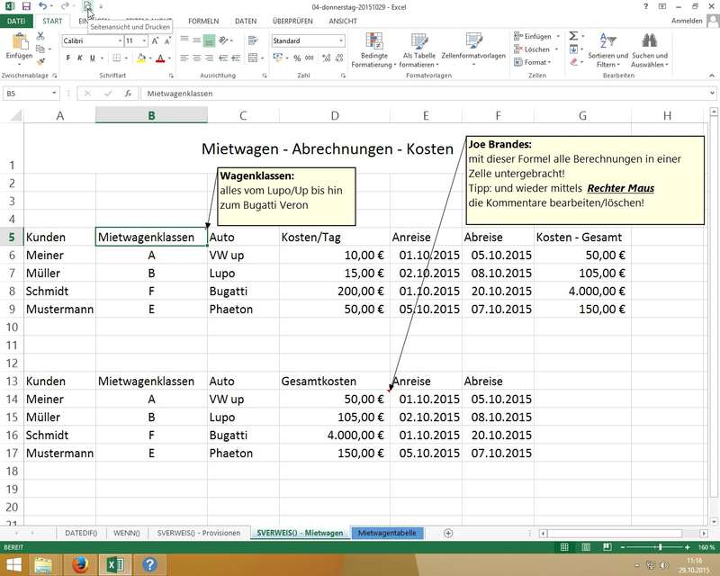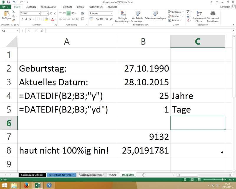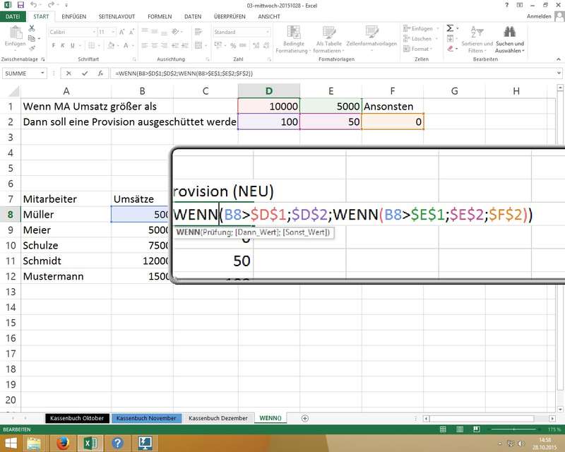 Wichtig: Excel merkt sich absolute Pfade (z.B. '[03-mittwoch-20151028.xlsx]Kassenbuch Dezember'!$F$3) - man darf also die Position in den Ordnern (Pfad) und den Dateinamen der verknüpften Mappe nicht ändern! - WENN-Funktion