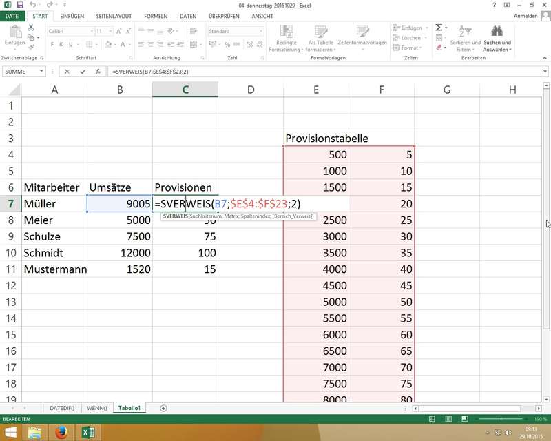 =SVERWEIS( B4 ; Provisionstabelle[#Alle] ; 2 )