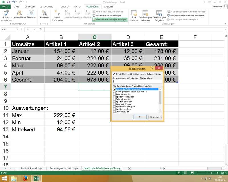 Ribbon Überprüfen - Blatt schützen den Schutz aktivieren/deaktivieren