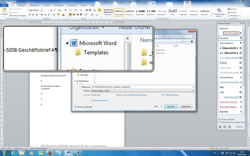 Übung: neue Dokumente basierend auf den Vorlagen geöffnet (Datei - Neu - Meine Vorlagen) und nach der individuellen Anpassung als eigene neue Dokumentvorlagen in .\Templates\MeinOrdner gespeichert