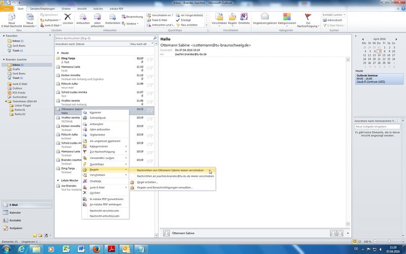 Im Rahmen der EDV-Mitarbeiterfortbildungen der TU Braunschweig findet am 07.04.2016 am Gauß-IT-Zentrum in der Hans-Sommer-Straße 65 ein "Outlook 2010 - Seminar" statt.