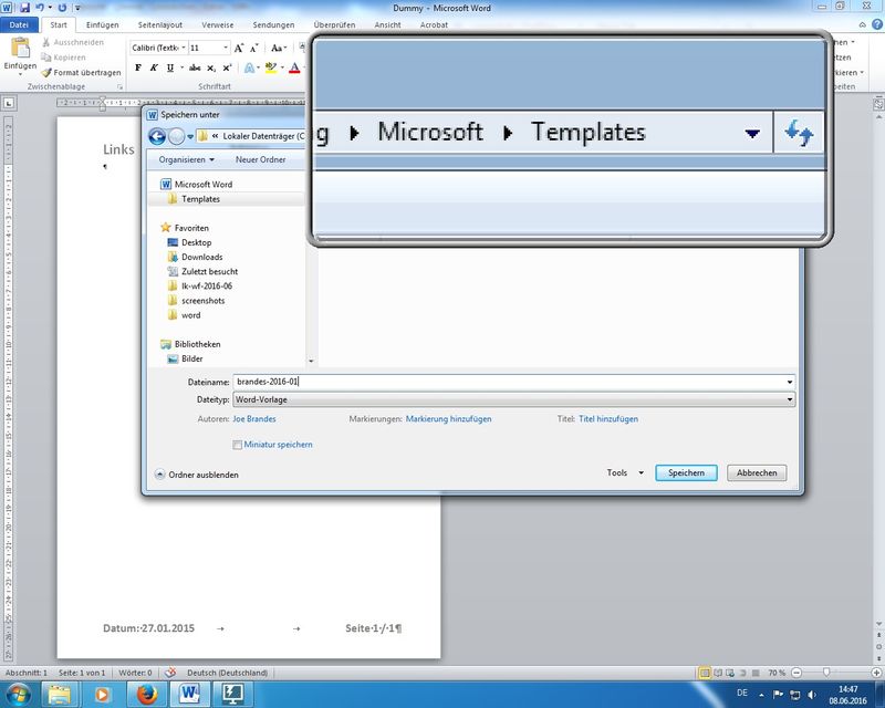 Beachten: Ordner Templates zum speichern nutzen - hier der Standardpfad bei lokalen Templates:C:\Users\username\AppData\Roaming\Microsoft\Templates(username ist Ihr Benutzername auf Windows-System)
