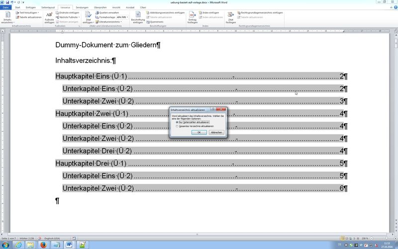 für Inhaltsverzeichnis (technisch: eine Feldfunktion); Aktualisieren über Klick und Funktionstaste F9 oder natürlich wieder Rechte Maustaste - Felder aktualisieren... (nur Seitenzahlen oder auch gesamtes Verzeichnis) - Dokumentvorlagen (*.dotx, *.dotm - erläutert und Übungen)