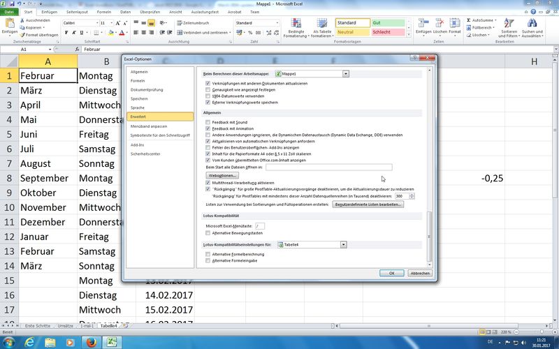 Excel 2010: Excel-Optionen - Kategorie Erweitert - nach unten scrollen - Benutzerdefinierte Listen