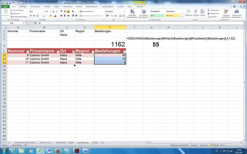 Zusammenhang mit DB-Funktionen (DBSUMME, DBANZAHL); auch hier wieder Einsatz von "Als Tabelle formatieren..."