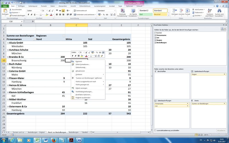 Gruppierte Bereiche (in Zeilen und/oder Spalten) möglich: zusätzlich Zeilen für "Firmenname" mit Feld "Ort" erweitert - also als 2. Zuordnung bei den "Zeilenbeschriftungen" hinzugefügt