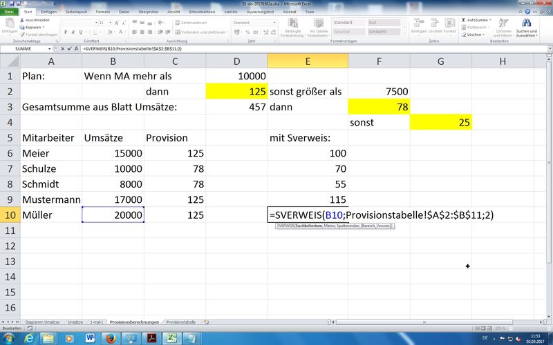 mit SVERWEIS lassen sich aus Bereichen (Matrix) die entsprechenden Ergebniswerte aus den 2. / 3. ... Spalten auswerten:=SVERWEIS( B4; $A$2:$E$6 ; 2)=SVERWEIS( B4 ; Provisionstabellenblatt!$A$2:$E$6 ; 2 )